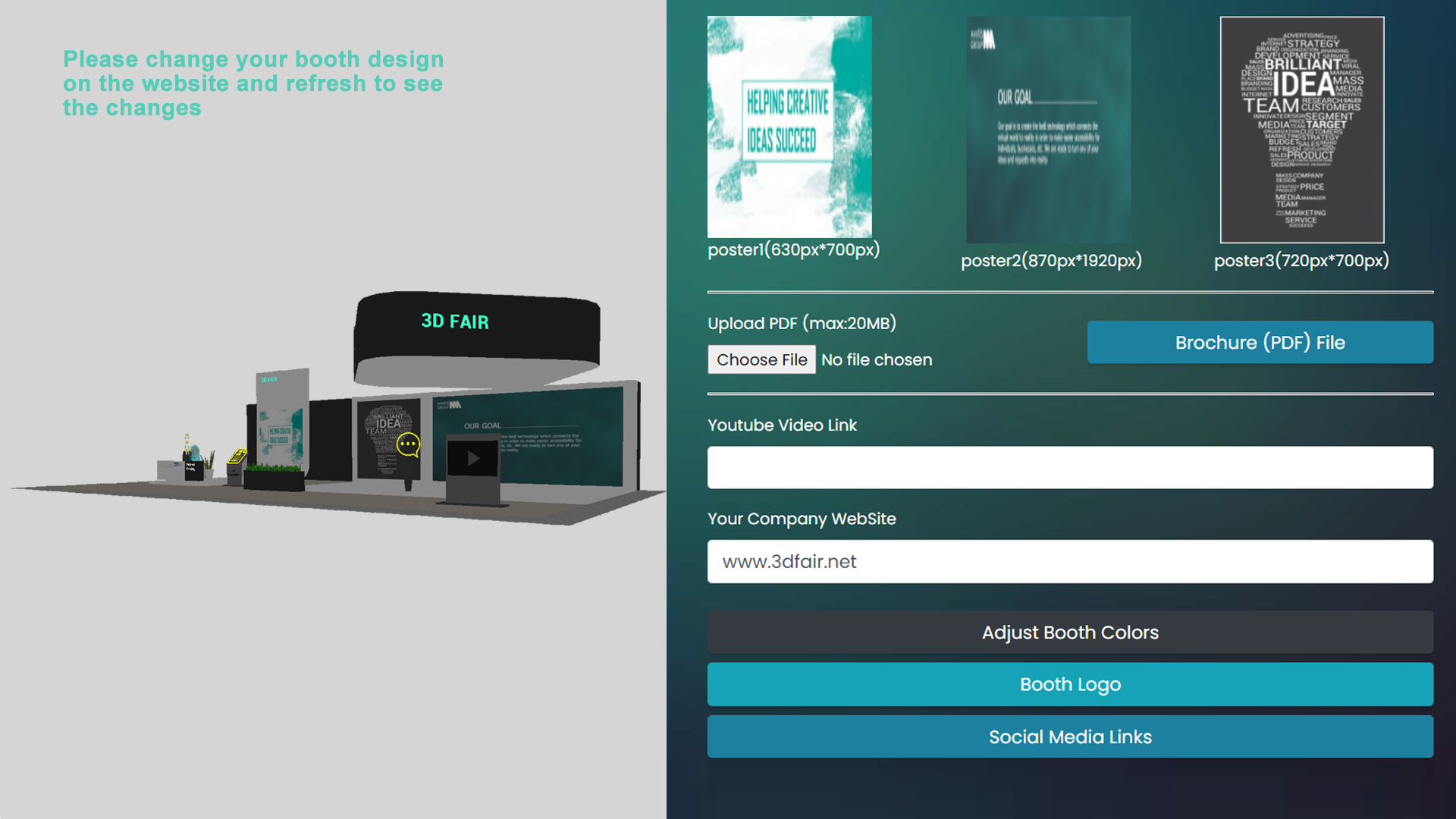 Simply access for exhibitors to insert posters, video link, brochures, booth colour and social media links of their companies to their booths.